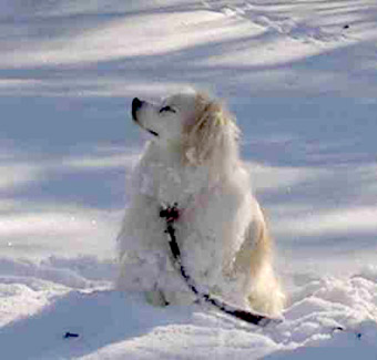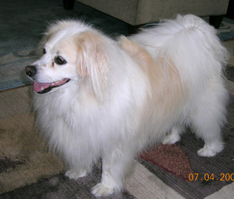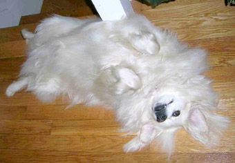 | His fur was previously cut in an attempt to alleviate allergy problems in his family. Although short, the fur is healthy and soft. He enjoys being groomed. He has pretty, long white Eskie eyelashes and a curled up tail. | ![]() |