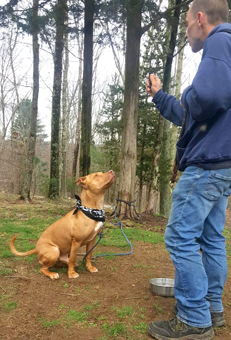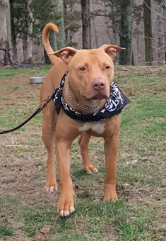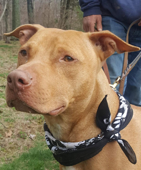Golden joined us last spring, and quickly became one of our training superstars. He appears to be largely American Pitbull Terrier, and embodies the best characteristics of this noble breed. He is a large strong dog at 65 pounds, with a lean, muscular physique, stand up ears, and a handsome blond coat. Golden truly represents the best of beauty and temperament in the APBT breed. |