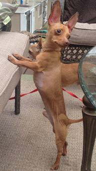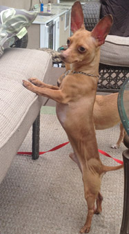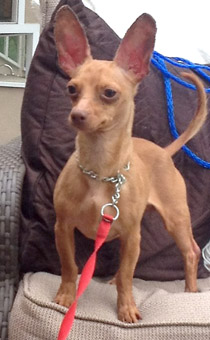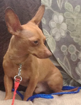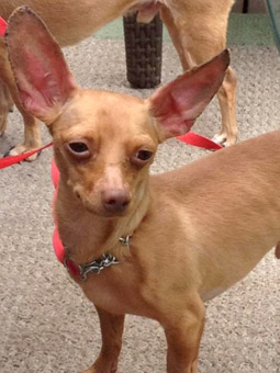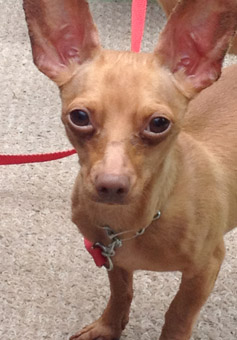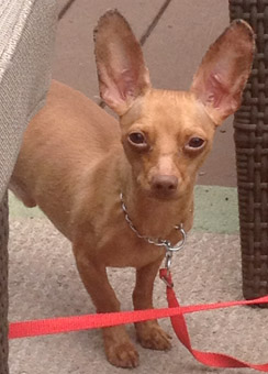 Poppy was billed to us as a Chihuahua mix, but there is no mistaking the Miniature Dachshund in him. Poppy is a tiny dog, weighing only 9 pounds, and has a long, squat structure. His short legs, paddle feet and elongated spine signify his Dachshund roots, While his light tan coloring and pointed mega ears reflect the Chihuahua edge. |