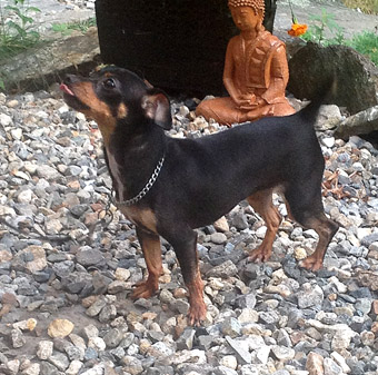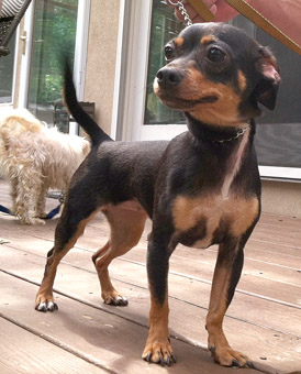 ROSELovely Rose takes our breath away: What a spunky little beauty, who promises to keep her adopters on their feet! We were gobsmacked when our Facebook Guru/Min Pin Maniac spotted Rose on the Dreaded Euthansia list in an Animal Control facility. Rose is only two years old!!! How the heck did this happen? Well, her story is such a familiar one, that we are hard pressed to find a new and creative way to tell it. Rose was a big city stray, charming her way through the diciest of neighborhoods, on the stroll for a good meal. In the blink of an eye, Rose found herself in the clink. As a stray, Rose was in limbo until efforts could be exhausted to find her owners. During that brief time frame, Rose caught kennel cough and was rejected from the adoption program.....and slated for the Kill List. |