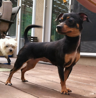 Rose is a petite cutie, and weighing only 9 pounds, she is the ideal companion dog. We peg Rose as a cross between Miniature Pinscher and Miniature Dachshund. She has the classic black and tan coloring of both breeds, with a splash of white across her chest. Rose's spine is slightly elongated, and her legs short, to reflect her Dachshund DNA, but the Min Pin influence adds some strength and structure to her stance. In the long term, this will reduce the risk of back issues that plague purebred Doxies. |