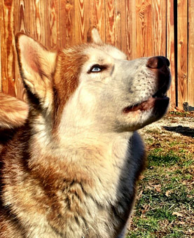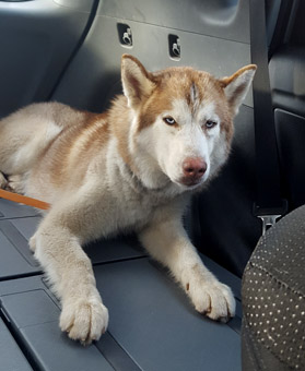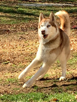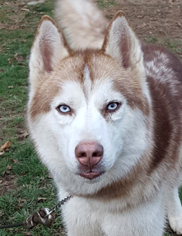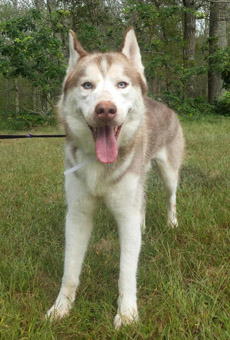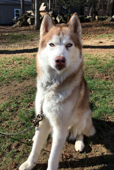 | Zeus is estimated to be four years old, and is a large 50 pound dog. He is a stunning red and white Siberian Husky, with iridescent blue eyes. His appearance is striking and unique. We consider Huskies a challenging breed, best served by experienced Husky folks, and Zeus is a typical Husky. He has not had much leadership in his former home, and is used to calling the shots. We found his Alpha wannabe vibe easy to redirect into an obedience sequence, and found him a joy to train. He does need a firm handler, willing to instruct family and friends on appropriate handling. Zeus is not a fan of the overzealous roughhouse play. In the right hands, Zeus is a Husky lovers dream come true. | ![]() |
